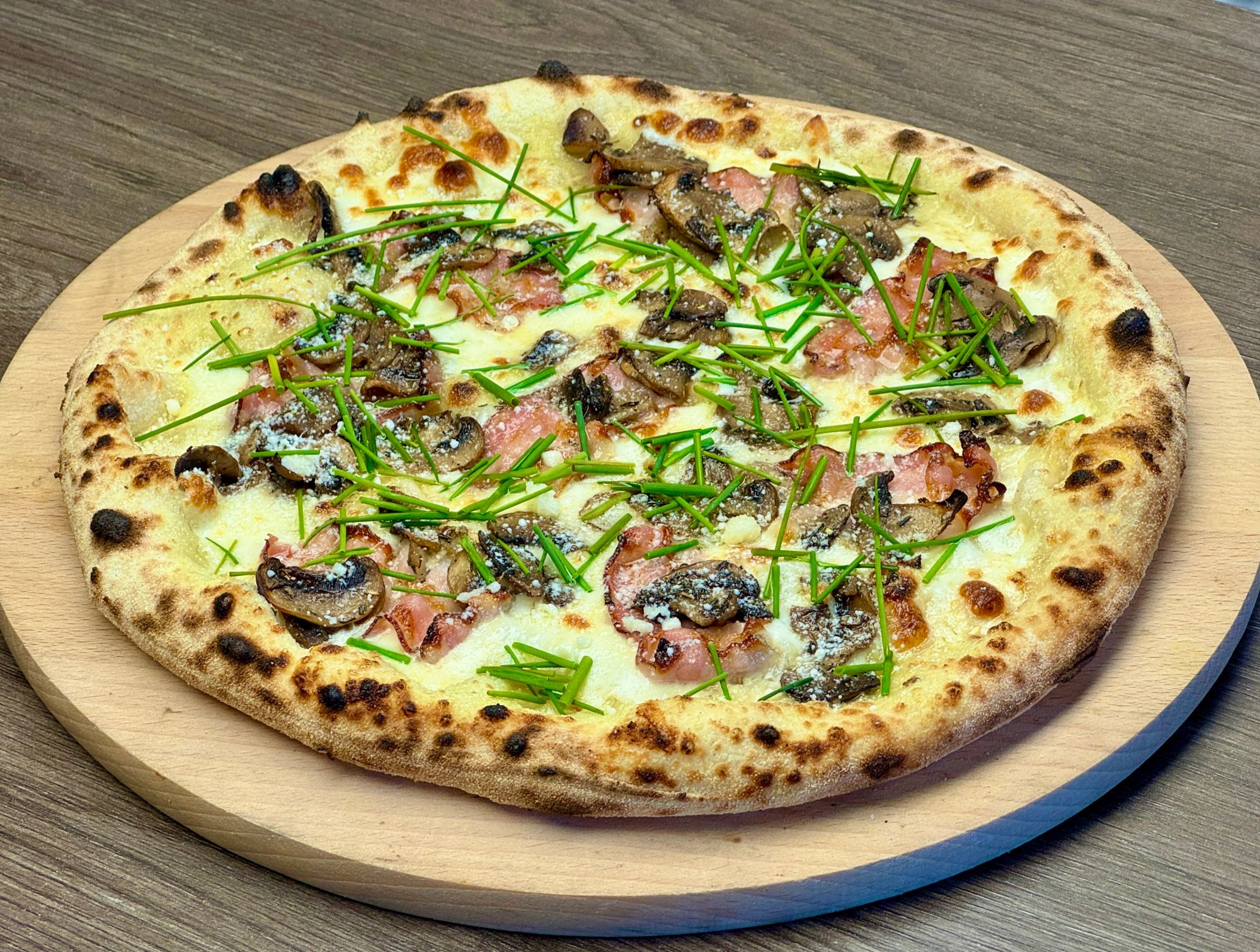 sos śmietanowy, grana padano, mozzarella, pancetta, grillowane grillowane, czosnek, szczypior, pecorino romano